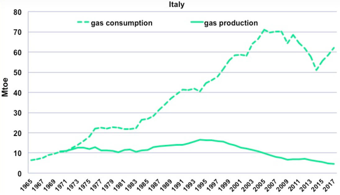 The fascinating map below shows the extent to which this dependency on gas has become characteristic of Italy. In fact, only Russia and Belarus have a higher dependency on natural gas as energy source, the former being a major producer and the latter being completely dependent on the former. While it may seem that Italy’s situation is not much worse than the UK’s, let’s not forget that the UK’s domestic gas production still represented 50% of the country’s total consumption in 2024, although this number has been falling rapidly over the last decades. After a short-lived peak production in the 90s, Italy currently only covers 4.2% of its total gas consumption from domestic production.