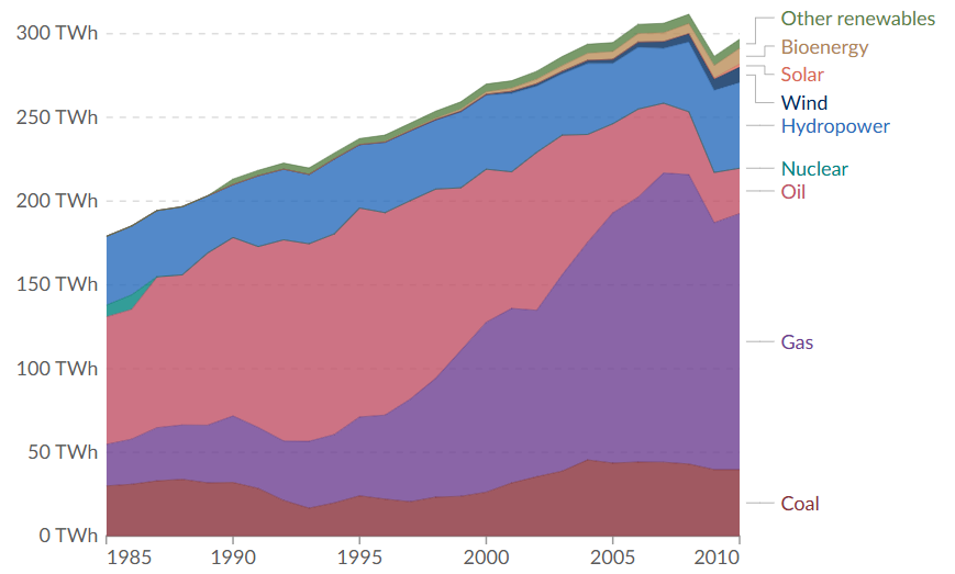 Following the oil shocks of the 70s and the favourable alignment of factors pushing for natural gas (development of more efficient combined cycle gas turbines, privatisation of energy producers in the 90s leading to investments in these more profitable power plants, phase out of nuclear power in 1987, increasing environmental pressures), gas also started to make its way in the electricity sector by replacing oil-fired power plants. With gas pipeline infrastructure already in place, the transition to gas in the power sector was a low-hanging fruit. Natural gas has since played a key role in the country’s electricity mix.