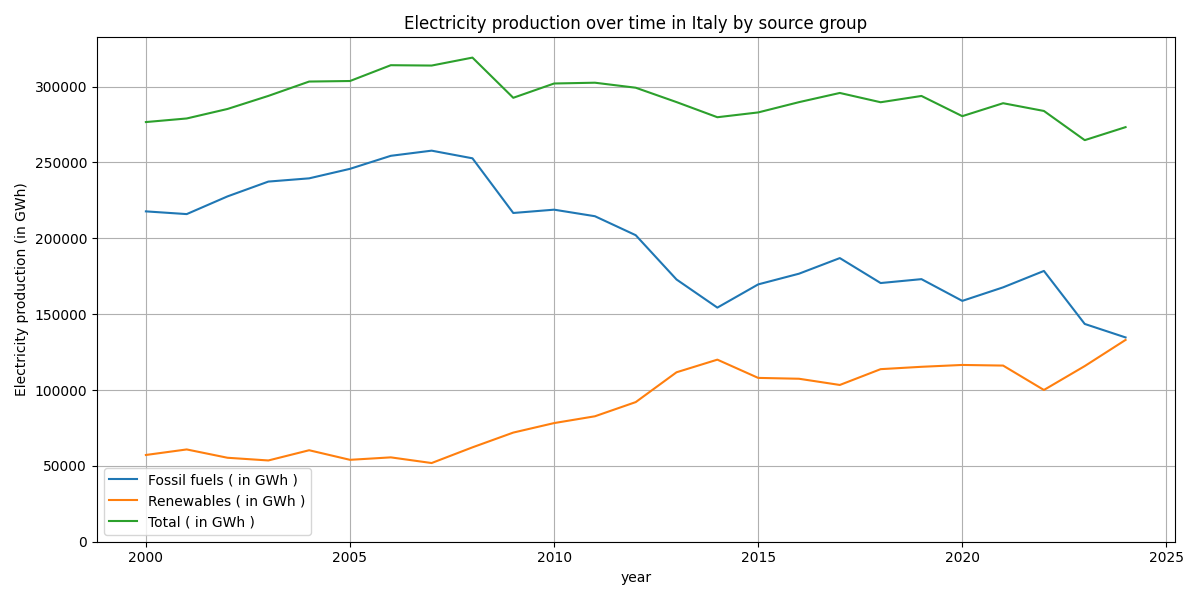 More importantly, it seems that the nearly perfectly parallel evolution of total electricity production and fossil-based production since WWII in Italy has met a definitive end in 2008, with the gradual uptake of renewables. After a 10-year plateau until 2022, a renewed uptake is observed in recent years. Although part of this can be attributed to good hydrological years, it is undeniable that particularly solar is experiencing a renewed uptake.