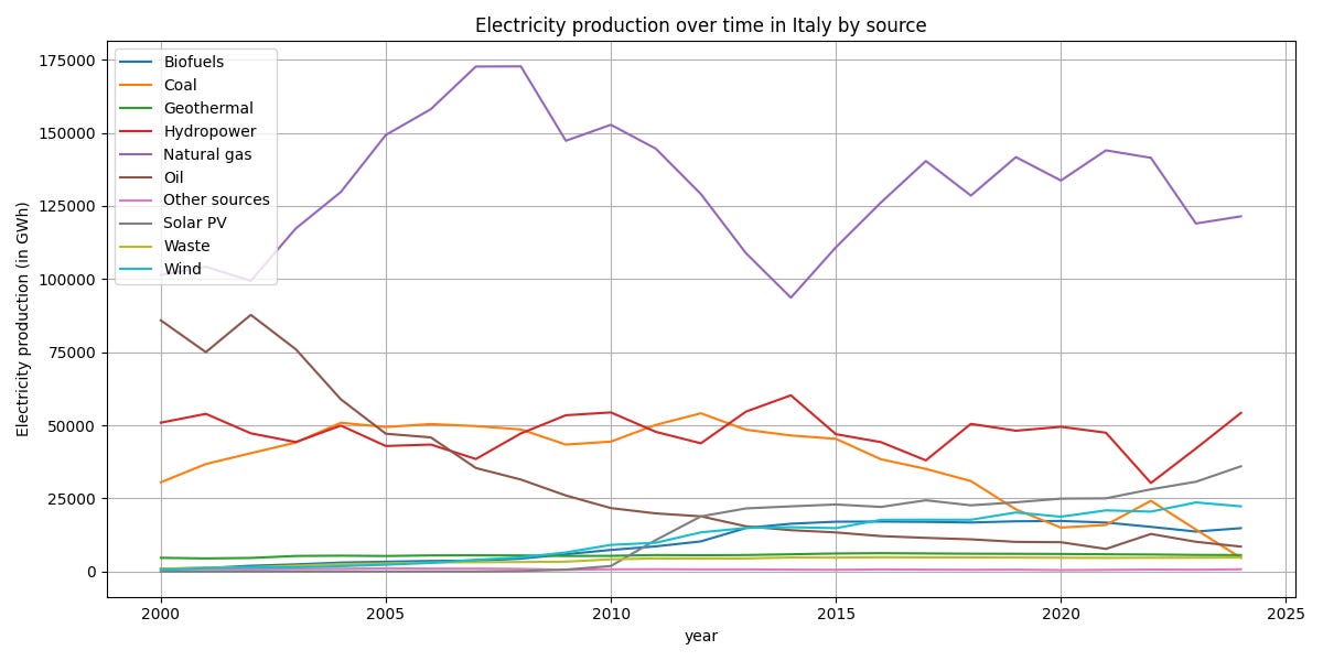 Secondly, the orange line corresponding to coal production has been steadily decreasing since 2012. Comparing values between 2012 and 2024, the output from natural gas and hydropower has barely moved, yet coal production has all but disappeared. While Italy’s total electricity consumption has slightly decreased over that timespan, the majority of the answer is to be found in the aggregation of solar PV and wind, which have seen a considerable increase over that timespan.